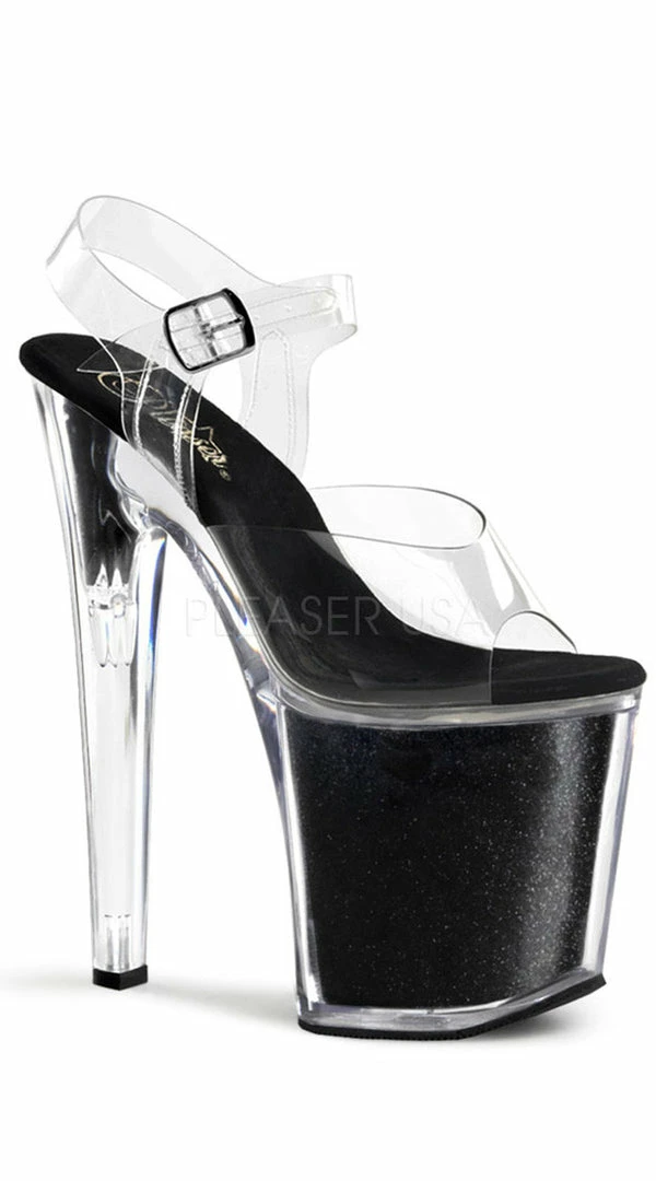This 8 inch heel has a 4 inch glitter filled platform and ankle strap close looks great with your favorite club dress.