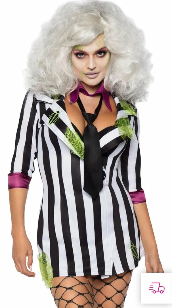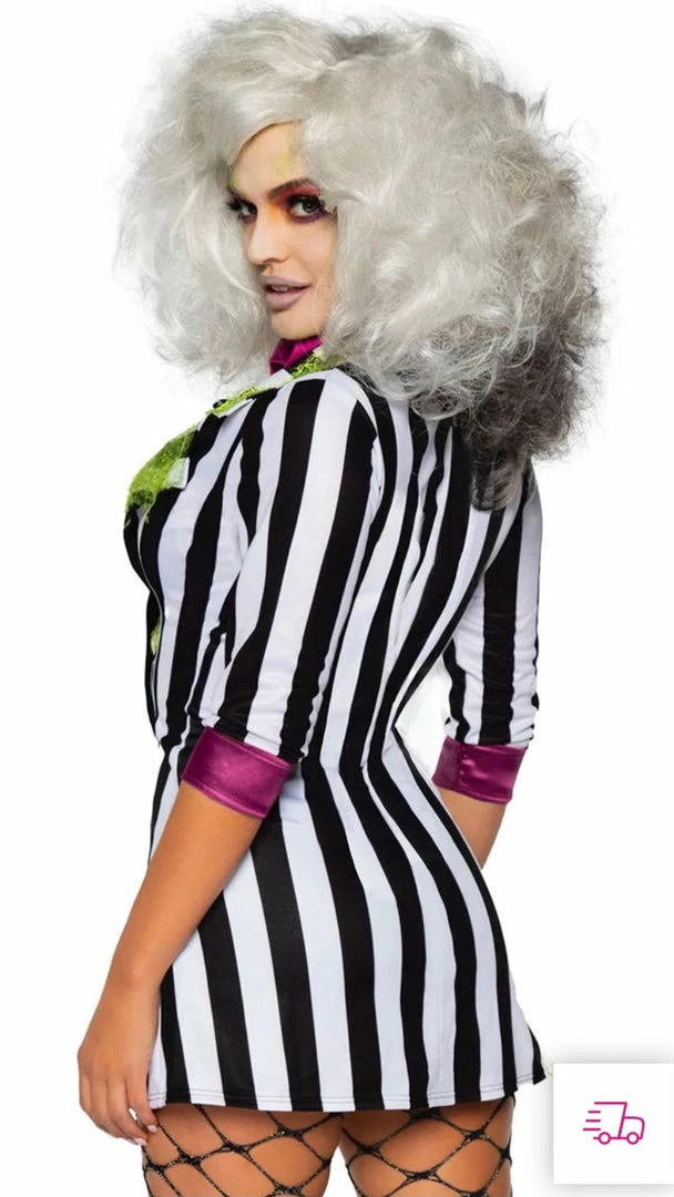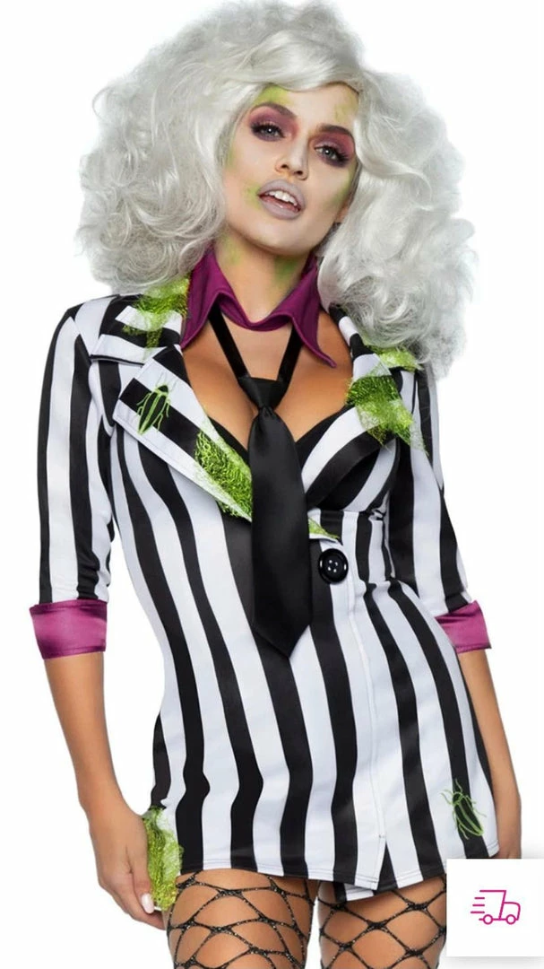 Say her name three times, and the magical trickster will appear before you in this black and white striped jacket dress with moss and beetle accents, elbow length sleeves, and a black tie with a purple collar. (Makeup, wig, and stockings not included.)