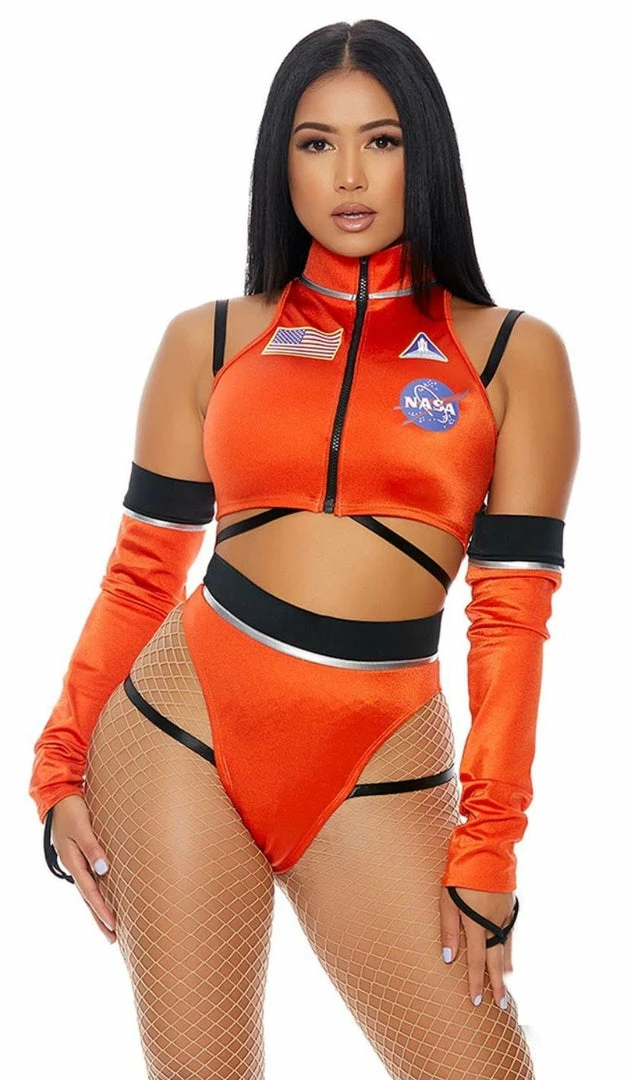 Get ready for takeoff! You’ll be the hottest thing in the universe in this Boost Me To Beyond costume featuring an orange metallic zip front crop top with strappy details and aerospace-inspired decals, a high-waisted bottom, and fingerless gloves. (Stockings and shoes not included.)