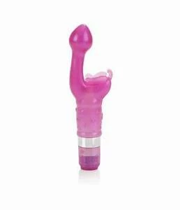 Tantalize your intimate pleasure spots with the Platinum Butterfly Kiss vibe. The discreet feminine arouser boasts 9 intense vibrations, pulsation, and escalation functions that simultaneously arouse, please, and tease the G-spot and clitoris. For ultimate sensual fun use the curvy, waterproof arouser in or out of the water. The massager measures 2.75” x 1.25”/7 cm x 3.25 cm and is made from pliable super soft, unscented, TPR, and has an ABS cap and silver-plated décor ring. The contoured pastel arouser has a flexible curve, with a bud-shaped G-spot tip and a butterfly teaser. To experience a pleasurable time select your preferred vibration, pulsation, and escalation from the 9 available functions. Once activated, the flickering butterfly antennae will sensually arouse you to ultimate climax satisfaction. For maximum tantalizing sensations always use a quality lube with the waterproof intimate massager. The vibe is suitable for erotic play in the shower, bath, or hot tub. The powerful arouser runs on 2 AAA batteries and has easy push-button control located in the end cap.