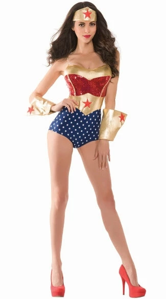 There’s nothing you can’t accomplish in this Wonderful Babe costume featuring a romper with a red sequin bodice, blue and white star print bottom, faux gold belt, gold trim bust, gold wrist cuffs with red star details, gold head piece and a red satin cape with gold trim.