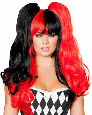Black and red costume wig with attached pigtails, long soft curls and bangs.