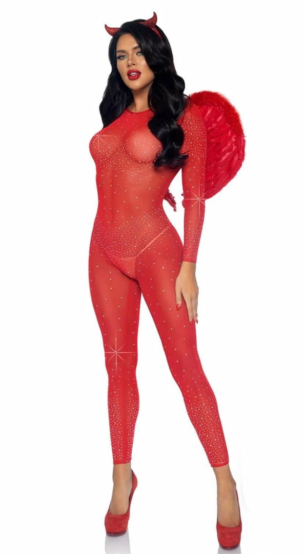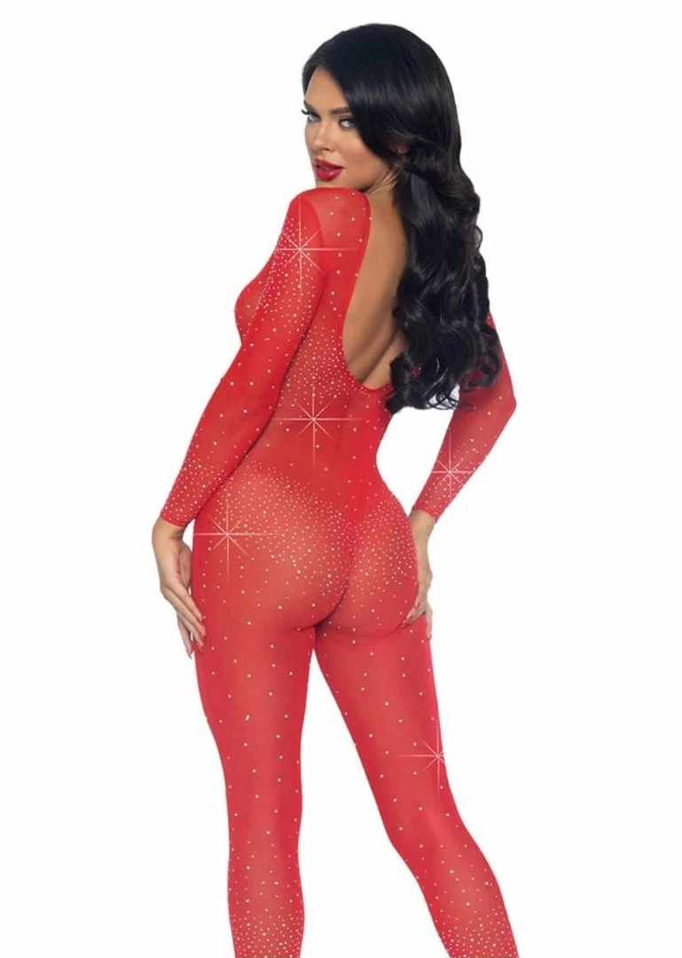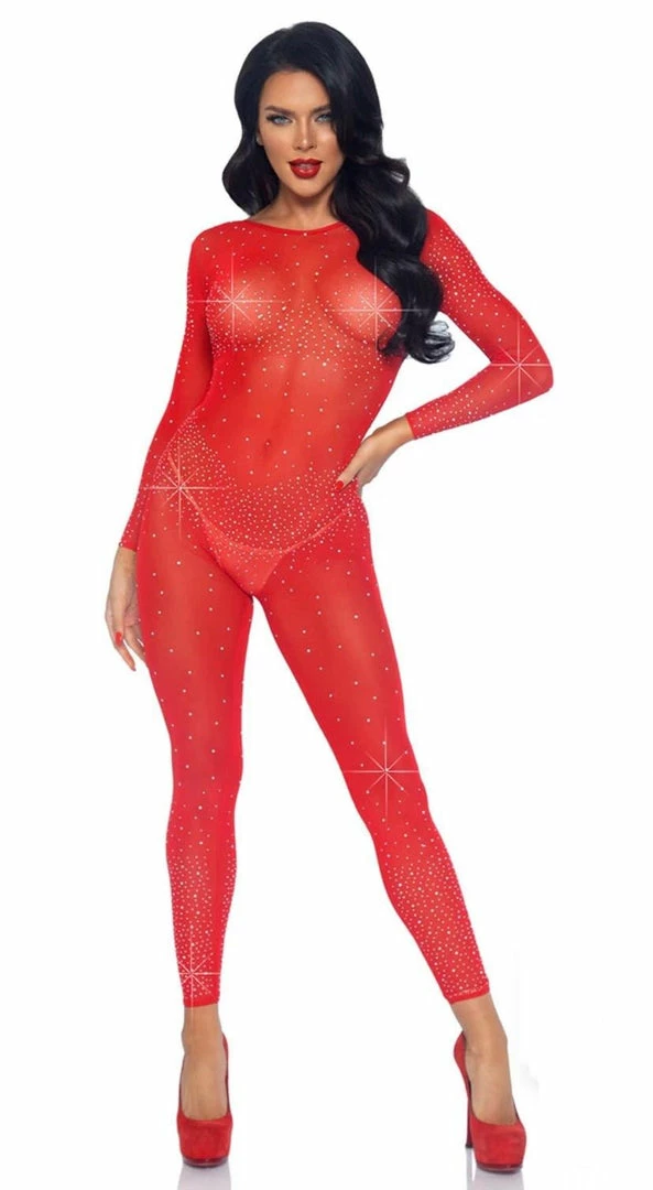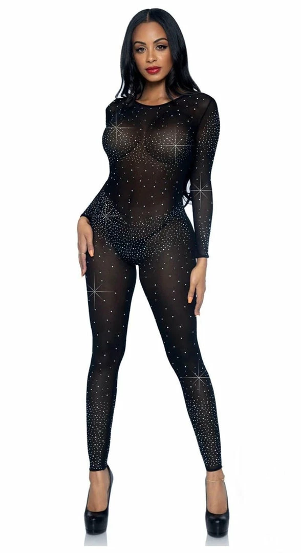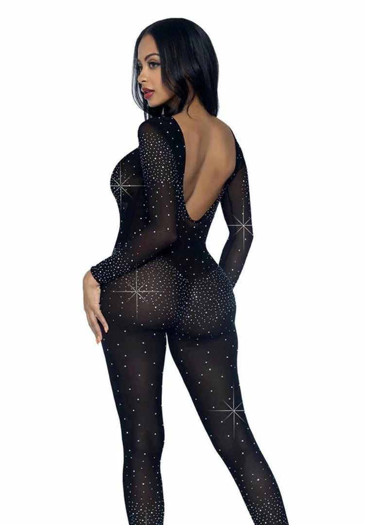 Highlight all your curves in this stunning catsuit featuring an all over sheer mesh with rhinestone accents, a scoop neckline, long fitted sleeves, a scoop back, and a fitted ankle length. (Catsuit only.)