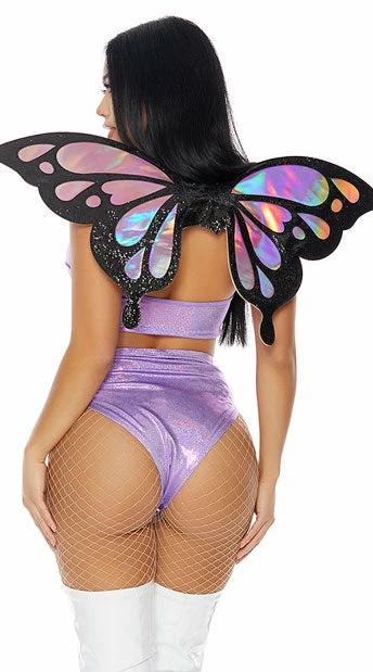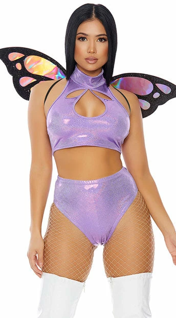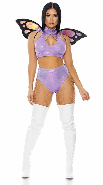 Float like a butterfly in this skin-hugging two piece set featuring a purple shimmer crop top with a high neckline, teardrop cut-out details, and a matching high waisted bottom with a cheeky cut back. (Wings, stockings, and boots not included.)