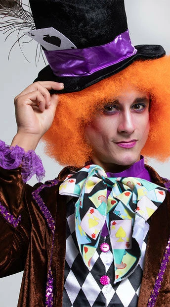 You’ll be mad as a hatter in a good way in this Men’s Hatter Madness costume featuring a brown velvet jacket, purple ruffled sleeve hems, purple accents, a tunic with an attached multi-colored bow tie, black and white diamond-patterned vest with pink buttons, and a large black top hat with purple sash, feather detail, and a playing card detail. (Pants, wig, and boots not included.)