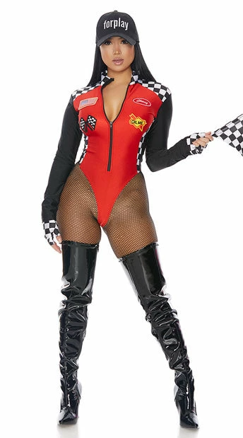 Gentlemen, start your engines! Ready to get their hearts pounding? Wave that flag like a pro in this Wanna Race costume featuring a red and black checker print bodysuit with a stand up collar and exposed zip front, American Flag and Oil Me bust patches, a cheeky cut back, checker print fingerless gloves for a photo finish, and aviator sunglasses. (Flag, stockings and boots not included.)