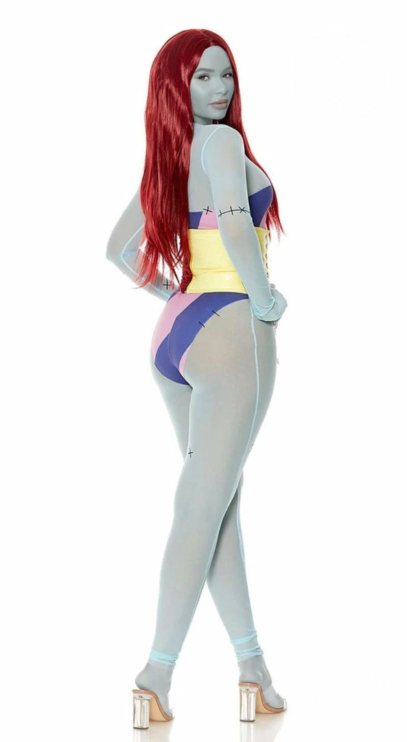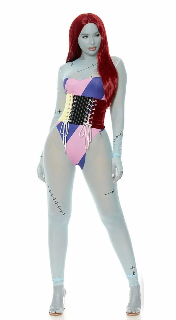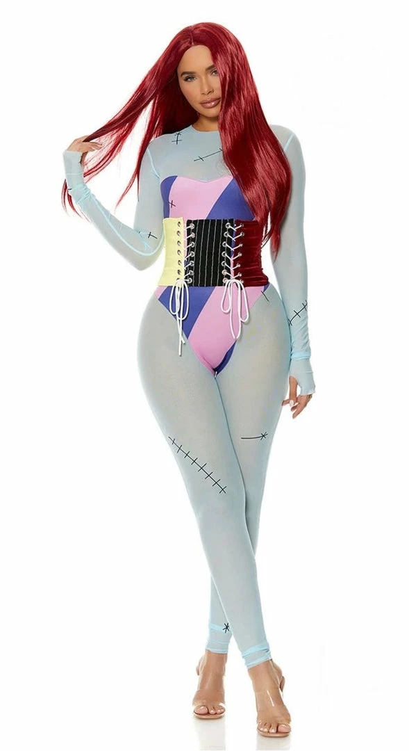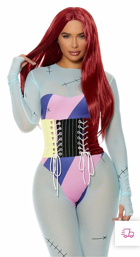 Whip up a magic potion so you can escape! You may be shy but get ready to let loose in this What A Doll costume featuring a long sleeve mesh catsuit with printed stitches, a striped bodice, and a contrast lace-up waist cincher. (Wig and shoes not included.)