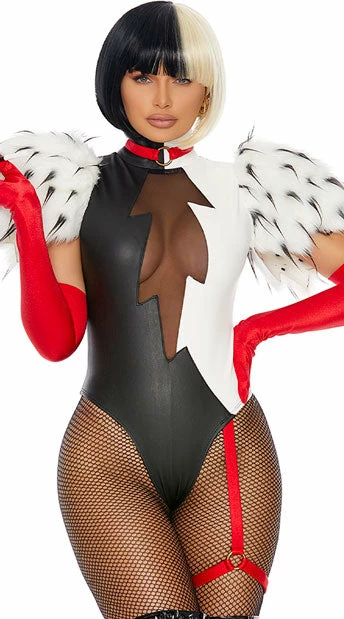 Keep it cruel, baby. There are 101 reasons to love this Cruella Intentions costume featuring a powerful black and white bodysuit with sheer mesh front, dog collar accent, faux fur puff sleeve shoulders, an attached red leg garter, extra long satin gloves, and a stylish cigarette holder. (Wig, stockings, and boots not included.)