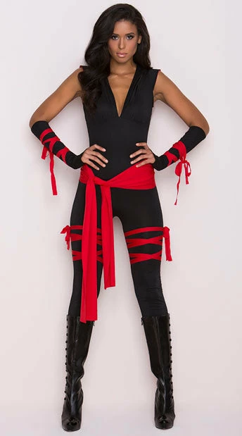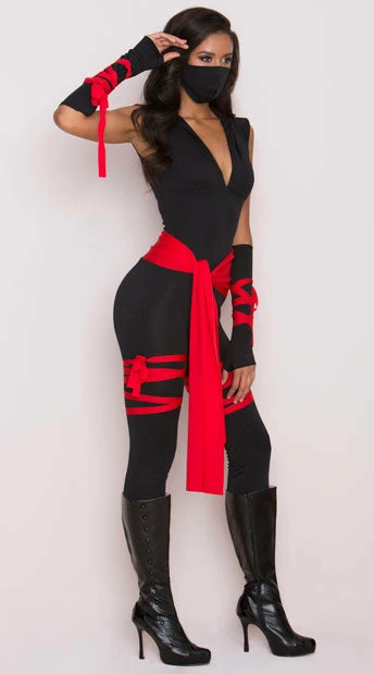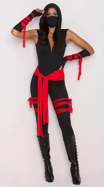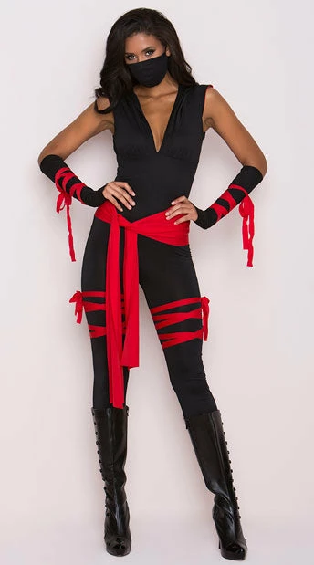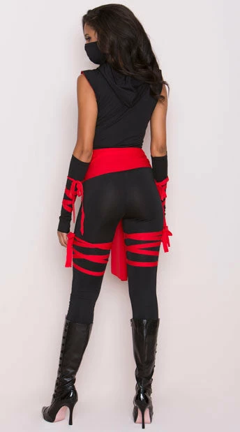 Slink into the shadows in this Deadly Ninja costume featuring a black catsuit with a deep V-neckline, an attached hood, a red waist sash, black, fingerless arm warmers with red lace-up detailing, red leg wraps, and a black face mask.