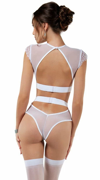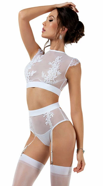 This exquisite lingerie set features a sheer mesh crop top with a high neckline, lace cap sleeves, floral lace appliques, an open back panel with a high button closure, a thick underbust band, a hook and eye back closure, and a matching high waisted panty with adjustable garter straps, an open back panel, a hook and eye back closure, and a high cheeky cut back. (Thigh high stockings not included.)