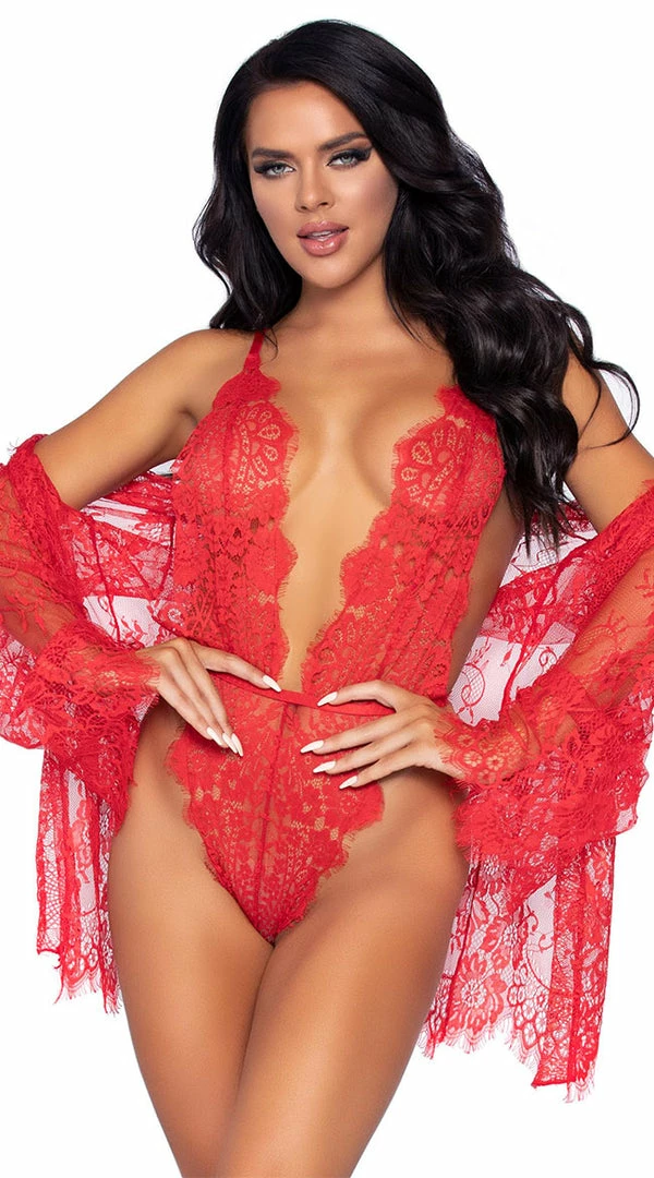 Don’t let your love go to bed without sweet dreams of you in this stunning floral lace teddy set featuring a plunging V-neckline with an eyelash trim, adjustable shoulder straps, intricate sheer cups, an ultra high cut waist, an open upper back, a cheeky thong cut back, and a matching long sleeve lace robe with an eyelash trim and a satin tie waist closure.