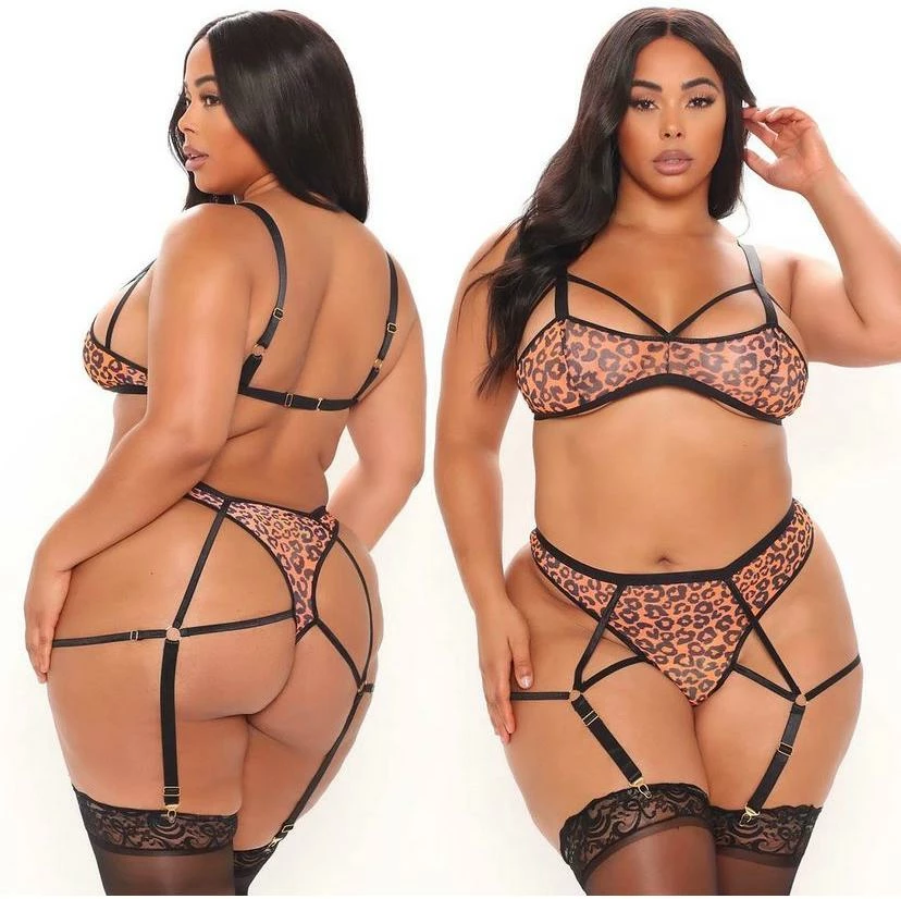 Don’t be an average jungle cat. Bring out the babe in you with this exclusive bra set featuring sheer leopard mesh triangle cups with strappy bust detailing, adjustable spaghetti , a hook back closure with gold hardware, a matching garter belt. (Stockings not included.)