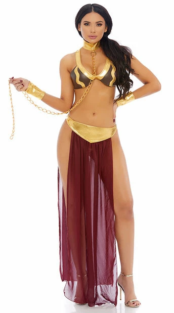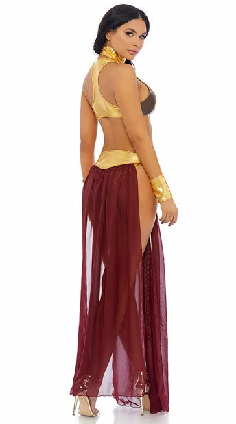 The force of sexiness will be with you in this Galaxy Slave For You costume featuring a faux leather bra top with metallic gold detailing, a scoop neckline, a racerback, a matching panty with a thick gold waistband, a draping burgundy skirt with open sides, a matching choker with a gold chain, and matching wristbands.