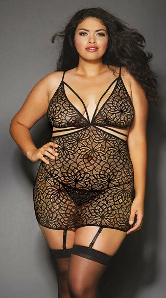 This striking plus size black chemise set features sheer embroidered lace cups with strappy detailing, adjustable spaghetti straps, a strappy cut-out underbust band, a sheer bodice, a multi-strapped back band, removable adjustable garter straps, and a matching panty. (Thigh high stockings not included.)