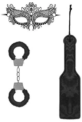 - Comes with an sexy lace mask, 12″ leather paddle and furry metal cuffs