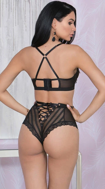 Bring the romance in this sheer high waisted panty featuring a striped mesh front with a floral lace overlay, a satin bow accent, sheer mesh sides, a scalloped lace trim, a striped mesh back, a back cut-out with a ribbon lace-up detail, and a cheeky cut back. (Bra not included.)