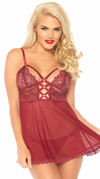 Keep the love alive in this to-die-for babydoll set featuring sheer lace cups with strappy detailing, silver O-ring accents, a criss-cross center panel, adjustable spaghetti straps, a lace underbust, a sheer loose bodice, and a matching g-string with double straps.