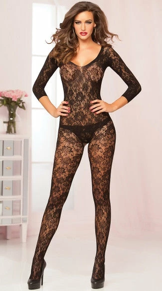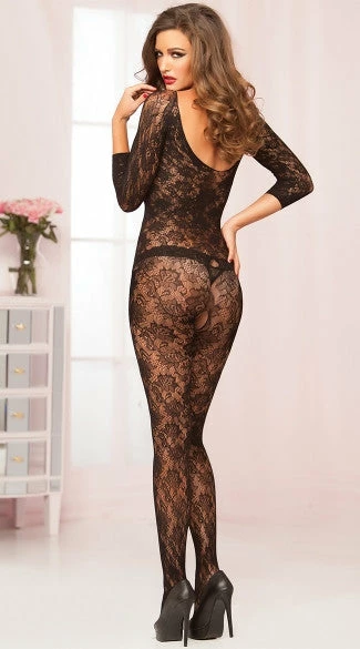 Black crochet, floral lace, crotchless bodystocking with scoop neck and 3/4 quarter sleeves. (Thong not included.)
