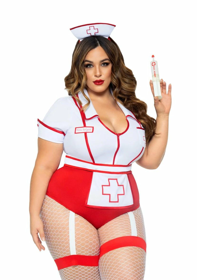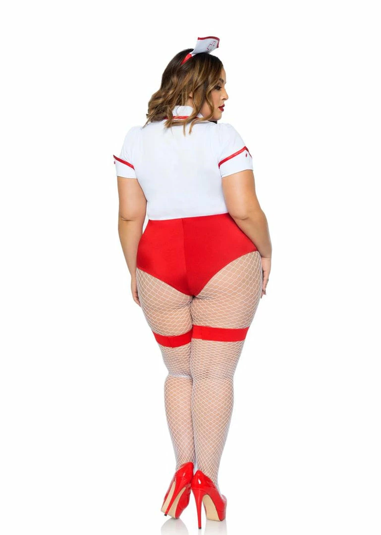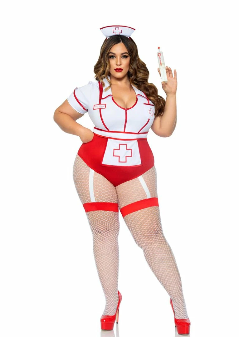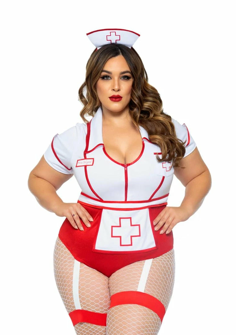 Show them what that sexual healing is all about in the charming Leg Avenue Nurse Feelgood. The ultra-sexy plus size nurse costume features snap crotch garter bodysuit with attached apron and hat headband.
