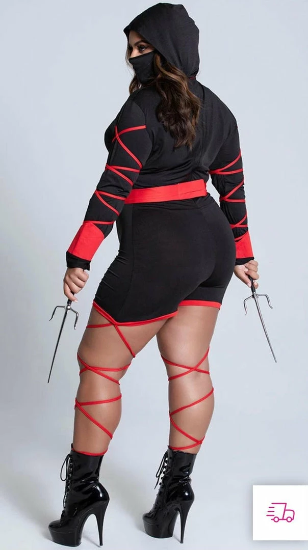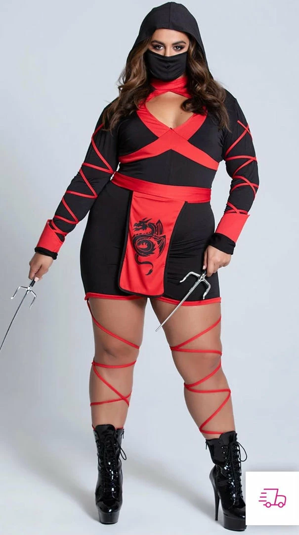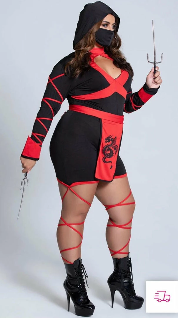 You will be able to slip in undetected to any party in this three-piece, plus size Dragon Ninja costume featuring a long sleeve black hooded romper with red trim details and attached red leg wraps, keyhole cut out bust, red waist sash with dragon emblem and black face mask. (Weapons, stockings, and shoes not included.)