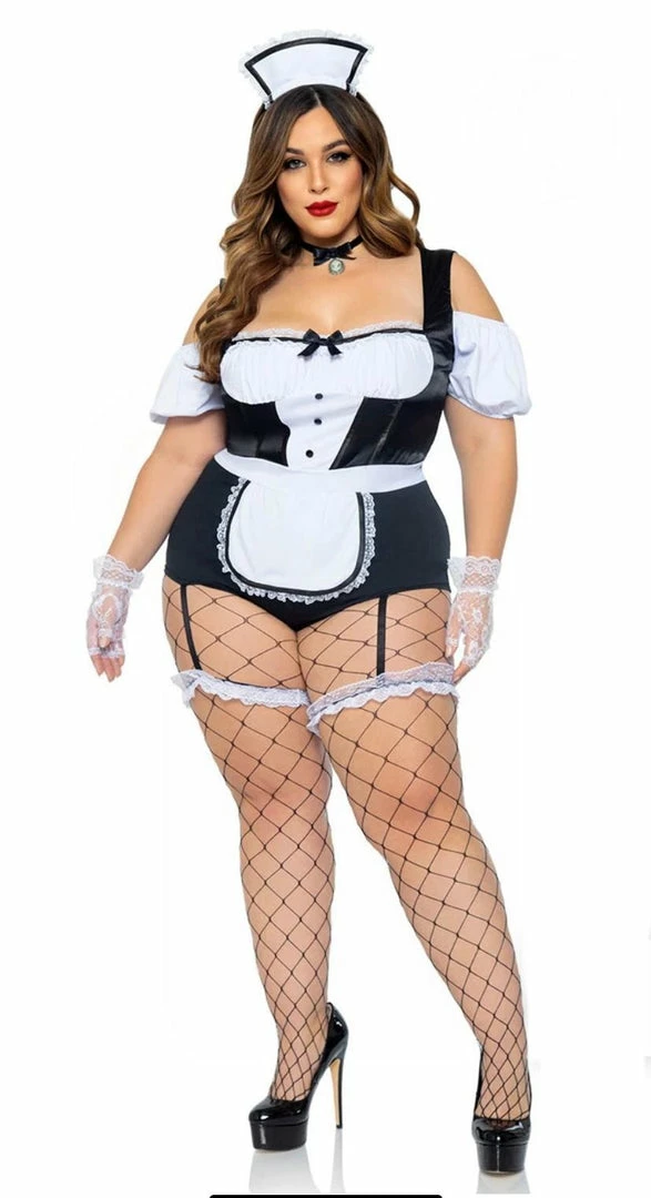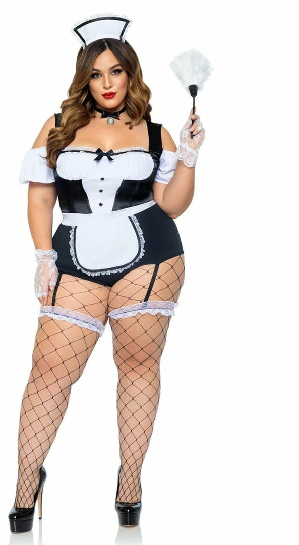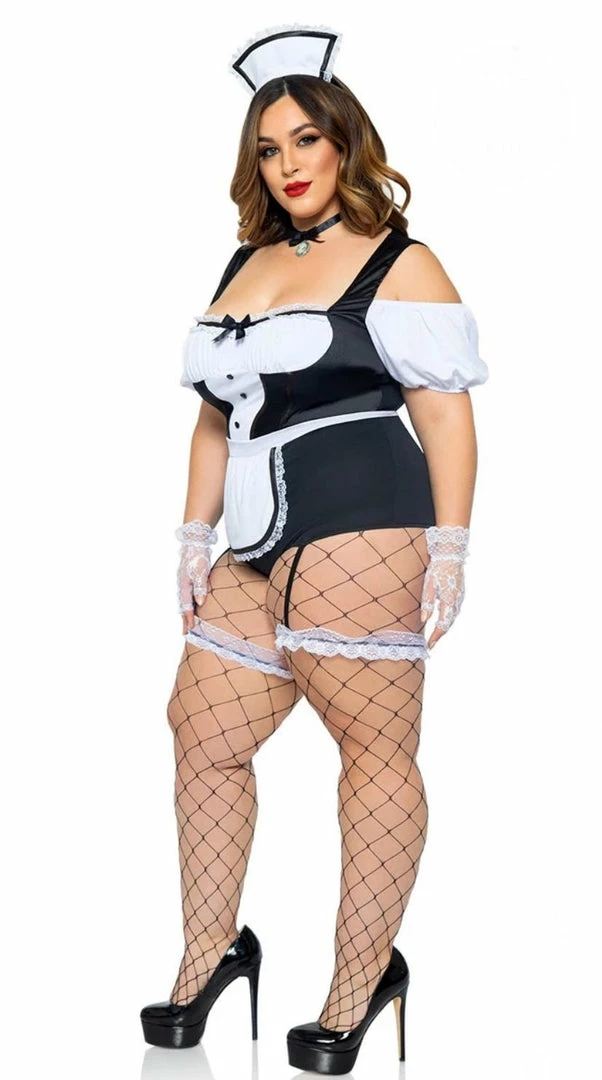 Is someone feeling dirty? It may be hard to keep things clean in this plus size Foxy Frenchie costume featuring a short sleeve black and white romper with a ruffled bust, thick shoulder straps, an attached apron, attached garter straps with wraparound leg garters, a choker, and a hat headband. (Duster, stockings, and shoes not included.)