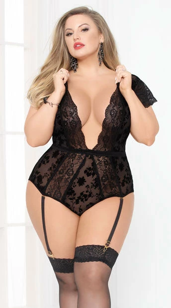 Feel freaky and get in the mood in this sensual plus size teddy featuring a low cut neckline, short sleeves, sheer lace cups, a T-shaped adjustable choker strap, a black satin waistband, a scalloped lace trim, a low cut back with criss-cross panel, removable adjustable garters, and a cheeky cut back. (Thigh high stockings not included.)