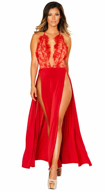 Radiate through releasing the seductress from within in this Radiant Red dress featuring a string tie halter top with a front lace panels, a deep neckline, an open back, and a billowing red skirt with waist high leg slits.