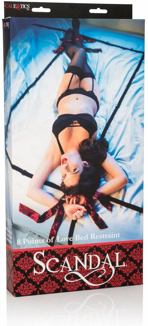 - UNLIMITED PLEASURE: Indulge in thrilling restraint play in the luxurious Scandal 8 Points of Love Bed Restraint; Ignite primal desires with 4 tether restraints, swivel clasps & 8 universal D ring attachment points for a customizable orgasmic experience