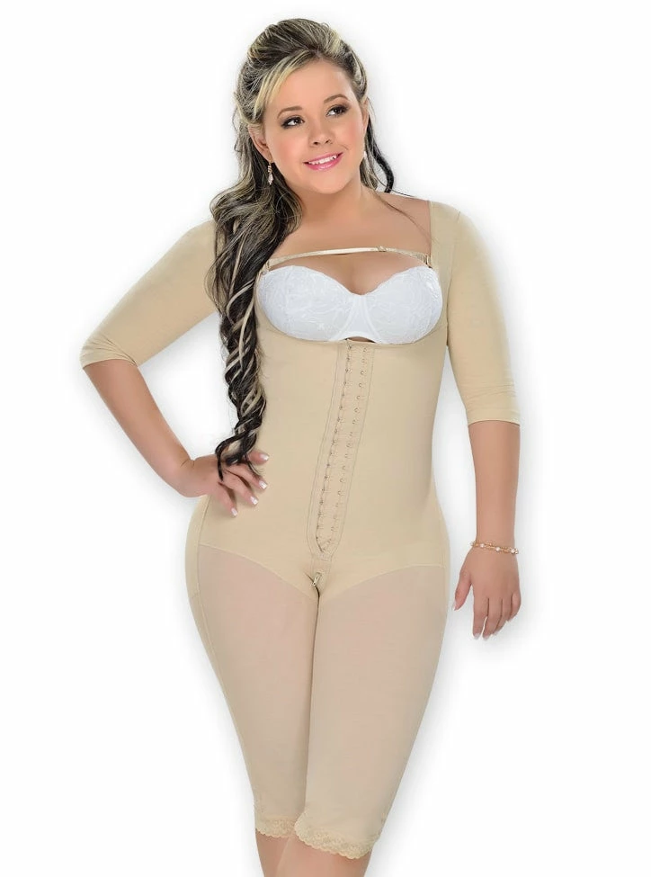 Faja larga, senos libres, con mangas, cierre parte inferior, 2 opciones de abrochadura.