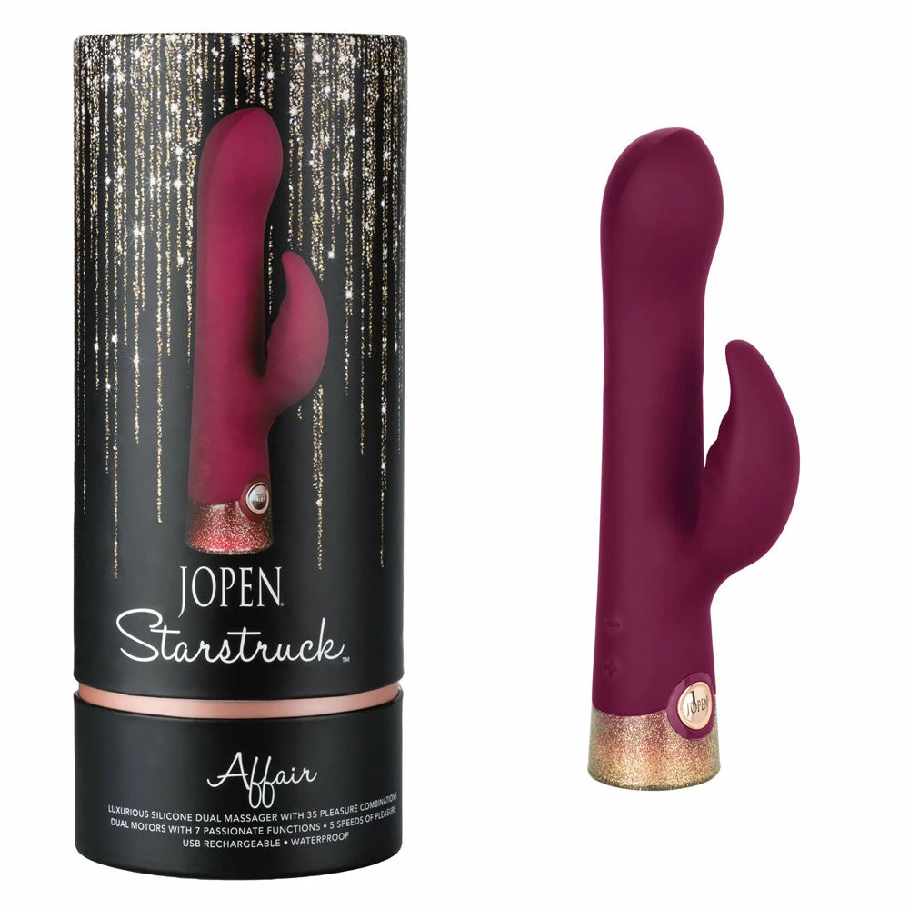 | Give yourself over to a sensual love affair with the flexible Jopen® Starstruck™ Affair. This deep rumbling beaded rabbit thrills with a rotating shaft, flickering teaser and 35 functions of vibration. Dial in to exactly what you desire with the sensually curved vibes incredible 7 pulsation, vibration and escalation functions and 5 independent speeds for every functions. Switch to your favorite setting with the easy-touch control buttons for frustration free control.The dual vibration motors are packed with 7 vibration functions with 5 speeds for every function for a plethora of playful pulsations. Synchronized non-jamming beads allow the pliable shaft to deliver deep, rumbling stimulation to internal pleasure points. Use the easy touch button controls to effortlessly indulge in thrilling pleasure and the travel-lock power button.Use the sleek 2-button controls to cycle through up to 1 hour of vibrations on low speed and 40 minutes on high speed. Use the provided USB charger to recharge your passion in only 2 hours. The versatile use and travel lock button feature make this handheld massager the perfect travel companion and let you embrace knee-shaking pleasure wherever your fantasies take you.