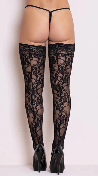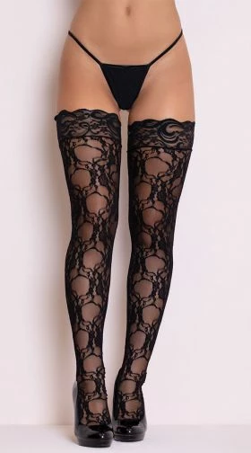 These sexy sheer thigh highs feature an allover lace design and a scalloped stay-up lace top. (Panty not included.)