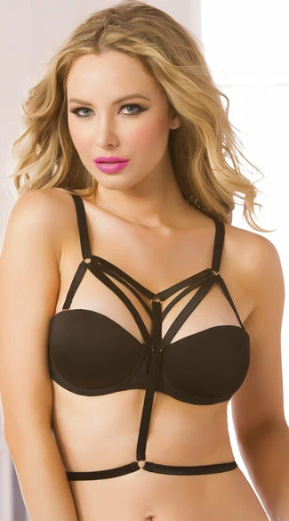 Dress up your sexy ensemble in this black strappy harness that attaches to your own bra! This harness features adjustable spaghetti straps, a multi-strapped bodice, an adjustable waistband, and gold O-ring accents. (Bra not included.)