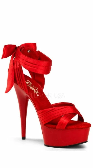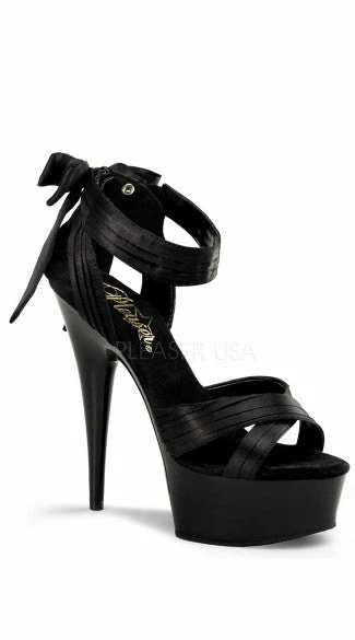 Dance the night away in this 6 inch satin sandal, featuring a pleated, criss-cross strap design, a zip up heel with a large bow accent, a 1.75 inch supporting platform, and a softly lined, inner sole.