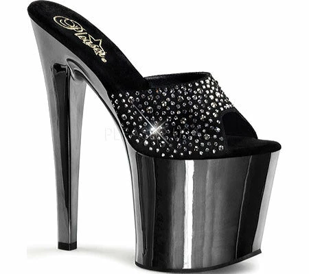Sexy and seductive these 7 1/2″ heeled sandals with platform slide feature all over rhinestone on vamp on a 3 1/2″ platform.