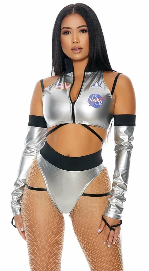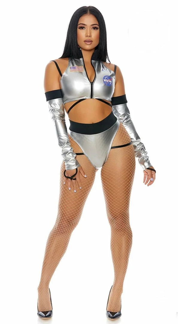 You’ll look out of this world in this To The Moon And Back costume featuring a silver metallic zip front crop top with strappy details and aerospace inspired decals, a high-waisted bottom, and fingerless gloves. (Stockings and shoes not included.)