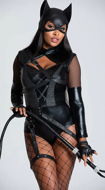 Meeeow! You’re sure to make felonious history in this Villainess Vixen costume!This mischievous costume features a black vinyl bodysuit with a high, cut-out neckline, long sleeves with sheer fishnet panels, a chain-mail bodice, strappy detailing, an attached garter with an O-ring accent, a high cheeky cut back, and a matching hooded mask. (Whip and pantyhose not included.)